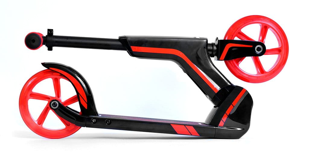 • Możliwość postawienia hulajnogi bez potrzeby opierania o ścianę - w tym celu należy pociągnąć uchwyt służący do składania i lekko obniżyć przód podestu, tak aby dotykał podłoża.